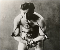 By the end of the year, Beck had the Houdinis playing in leading vaudeville houses from the Midwest to California; by early 1900, they were also a hit on Keith's East Coast circuit. Displaying a talent for publicity to match his abilities as an escape artist, Houdini performed jail escapes and other public stunts to lure people into theatres. Houdini, known variously as "The Celebrated Police Baffler," "The King of Handcuffs," and a host of other names, developed the basic routines which would make him a legend. After nearly a decade playing dime museums and circuses, vaudeville must have seemed like a different world. The Houdinis performed fewer shows -- before upscale audiences in lavishly appointed theaters -- and made far more money. At the turn of the century, vaudeville was the top of the entertainment pyramid, and Harry Houdini became one of its stars. (At left: Jail escapes were another favorite stunt of Houdini's. He never failed to fill the theatres at night after escaping from the jail cell in the town the day before.)